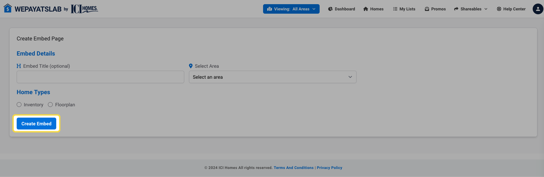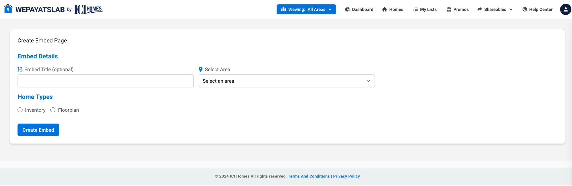 On the create embed screen, you can fill in the embed title, select the area you want to display homes for and choose between displaying Floorplan homes or Inventory homes.